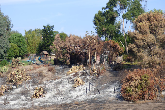 Burned trees and guardrail and, unfortunately, the burned house of neighbors on our street. |